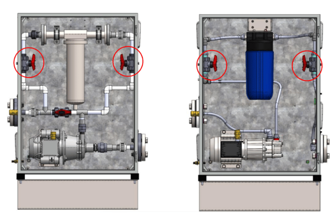 Step 1: At the filter isolate both valves* so that there is no flow through the filters. Switch the motor