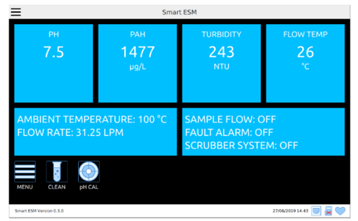 Step 3: Press and hold the Clean button on the touchscreen and follow the instructions shown on the screen. This will force the ESM into clean water mode and flush the cell with clean water. After 3 minutes press the abort button to stop the clean water flow.